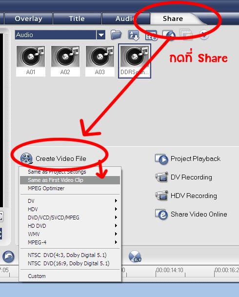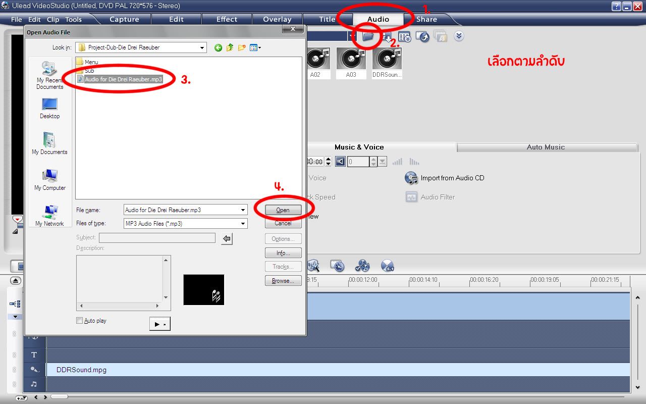 9. พอทำเสร็จแล้วก็เซฟเป็นไฟล์ Audio ประเภท Mp3. ซะ แล้ว import ใน Ulead ค่ะ แล้วก็ลากมันลงมาที่ Timeline ตรงแถวเสียงบรรยายที่เป็นรูปไมค์
