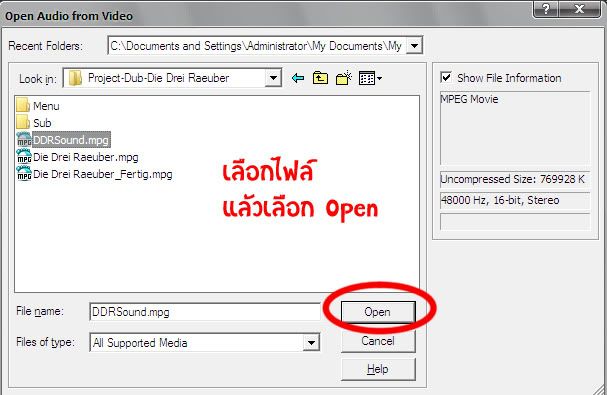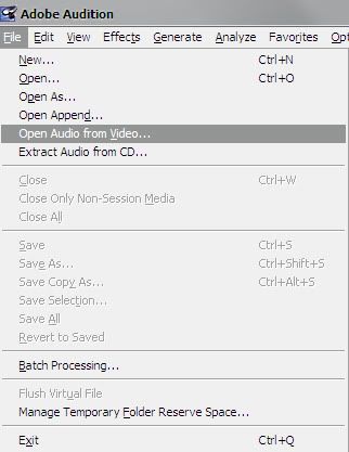 8. พอมันแปลงเสร็จแล้ว ก็เปิดโปรแกรม Adobe Audition ขึ้นมาค่ะ เลือก Open Audio from Video เลือกไฟล์จากข้อ 7 ค่ะ รอมันโหลดซะหน่อย ก็จะได้ไฟล์เสียงมาแล้วค่ะ