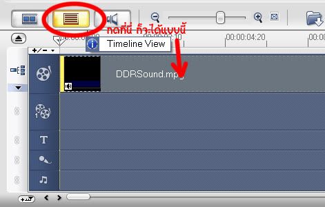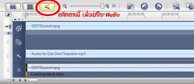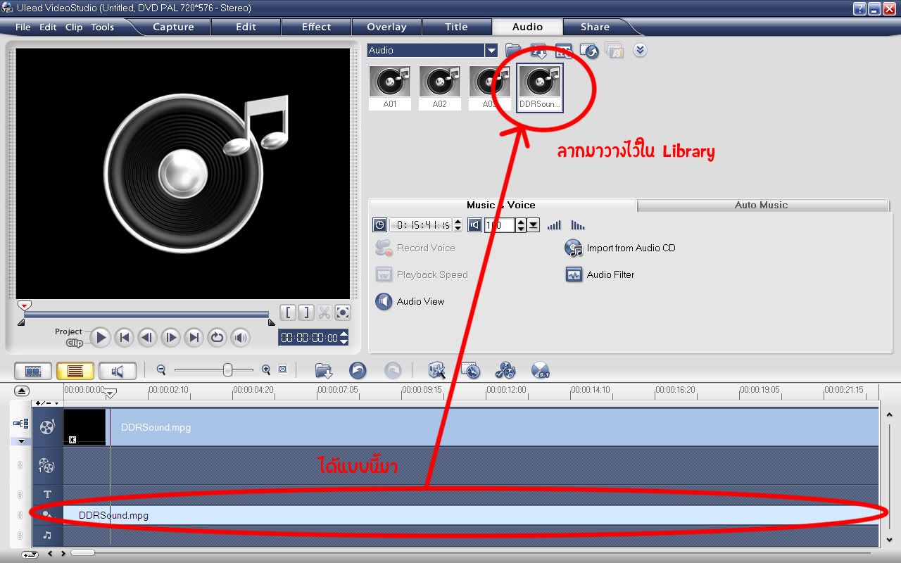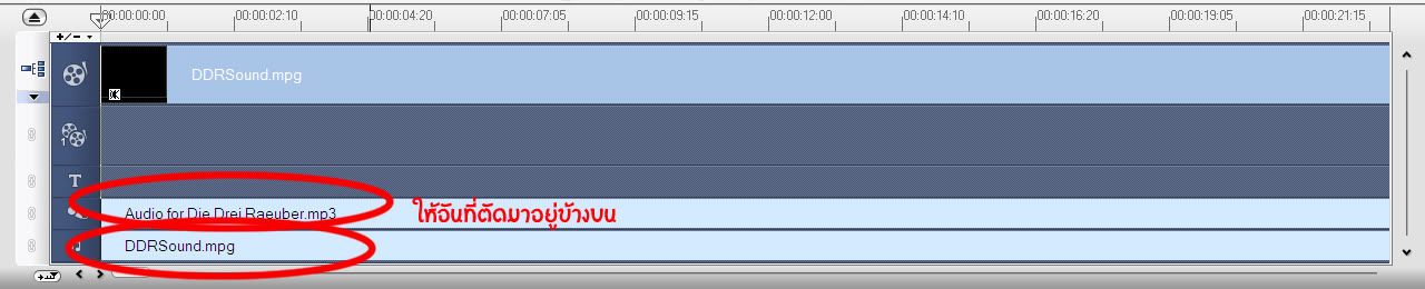 จากนั้น แล้วก็ลากไฟล์เสียงเต็มๆที่เราเก็บไว้ใน Library ก่อนหน้านี้ลงมาที่แถบเสียงดนตรีประกอบที่เป็นรูปตัวโน๊ตน่ะค่ะ ทีนี้เราก็จะมาใช้ประโยชน์กับเสียงทั้งสองแถวนี้กัน
