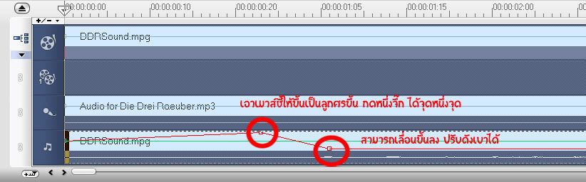 ทีนี้ลองฟังเสียงในแถบเสียงบรรยายที่เราตัดเสียงแล้วดูบ้าง กดคลิกหนึ่งที แล้ว Play ฟังดูว่ามีเสียงตรงไหนแตกมาก หรือเสียงพูดยังคงดังอยู่ เห็นจุดเล็กๆ บนไฟล์มั้ยคะ เอาเมาส์กดลงไป เราสามารถลากมันขึ้นหรือลงก็ได้ เป็นการเพิ่มหรือลดความดัง นอกจากนี้เรายังเพิ่มจุดได้ โดยการคลิกเมาส์ค่ะ เพื่อตำแหน่งที่เราอยากปรับเปลี่ยนมันไม่มีจุดให้ก็เพิ่มซะเองเลย ถ้าอยากทำ effect fade in fade out ง่ายๆ ก็มีให้เลือกนะคะ ใน Option Panel ทีนี้เราก็ปรับเสียงให้ดังค่อยตามความพอใจเลยค่ะ ต้องใช้เวลากับมันหน่อยนะคะ เสียงจะได้เนียนๆ