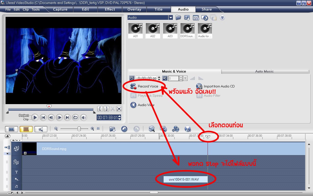 ใส่ด้วย ทีนี้มาเริ่มพากษ์เสียงกันได้เล้ย ก่อนอื่นก็ต้องมีไมค์เสียก่อน แล้วหาผ้าชิ้นน้อยๆหนาๆหน่อยมาคลุมหัวไมค์ไว้ เวลาพากษ์จะได้ไม่มีเสียงลม เพ่อะๆ จากนั้นเราก็เลือกตอนที่จะพูดให้พร้อม ทางที่ดีก็ลองฟังดูก่อนรอบนึง (จากไฟล์หนังปกติ) แล้วก็ลองพูดปากเปล่าจนคล่องเสียก่อน เมื่อพร้อมแล้วก็คลิกที่รูปไมค์ใน Timeline ก่อนหนึ่งที จากนั้นจึงกดที่ปุ่มแดงๆ Record ใน Option Panel แล้วเริ่มพากษ์ได้