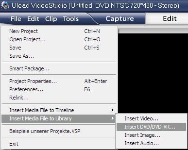 2. เปิดในโปรแกรม Ulead โดยถ้าหากไฟล์หนังเป็นไฟล์ของ DVD ใช้คำสั่ง open จะเปิดไม่ได้ ให้ใช้คำสั่ง Insert Media File to Library แล้วก็เลือกไฟล์หนังการ์ตุนที่เราจะพากษ์มาซะ โดยมันจะไปโผล่ที่ Library (ดูตามภาพ)