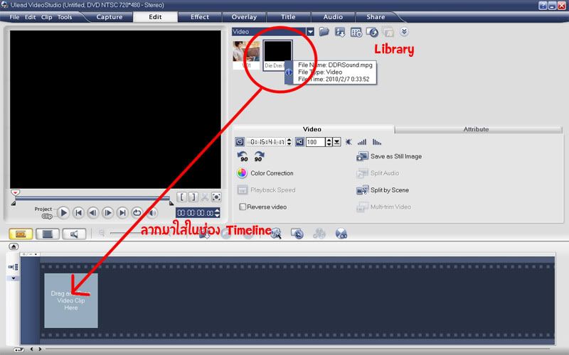 3. ลากไฟล์หนังมาใส่ในช่อง Timeline ซะ ทีนี้เราก็จะได้ไฟล์ที่เราจะมาตัดต่อ แก้ไขกันแล้ว