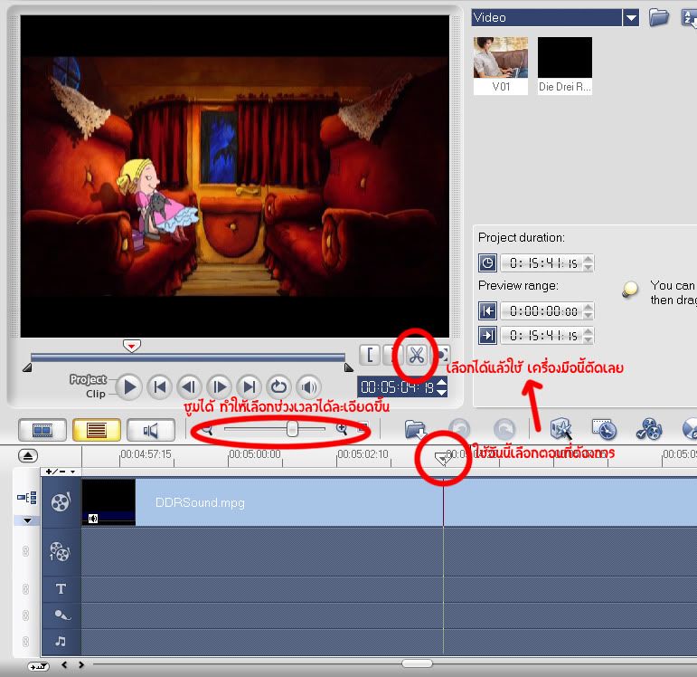 4. ต่อไปเราก็ตัดฉากที่ต้องการจะพากษ์ได้ ถ้าอยากพากษ์ทั้งเรื่อง ก็ไม่ต้องตัด ข้ามขั้นตอนนี้ไป สำหรับคนที่อยากจะพากษ์บางตอนก็เลือกตอนได้ โดยใช้เครื่องมือกรรไกรที่อยู่ด้านท้ายของหน้าจอแสดงภาพ ค่อยๆเลือกฉากที่อยากได้ โดยสามารถซูม Timeline ได้ ทำให้ละเอียดขึ้น เลือกเป็นวินาทีได้เลย พอได้ตอนที่อยากได้แล้ว ก็ตัดซะ ถ้าอยากได้หลายตอนก็ตัดมาเป็นส่วนๆ แล้วลบตอนที่ไม่เอาทิ้งไป