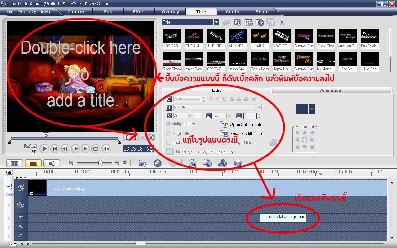 5. พอได้ตอนที่ต้องการมาครบแล้ว ขั้นต่อไปเราก็มาใส่ซับกันก่อน เวลาจะพากษ์จะได้มีอะไรเป็นสัญญาณบอกว่าควรจะเริ่มจะจบตรงไหน (เพราะต่อจากนี้เราจะลบเสียงพูดทิ้งไป) วิธีใส่ก็ง่ายๆค่ะ เลือกตอนที่ต้องการใส่ซับ แล้วคลิกที่ตัวอักษร T ตรงแถบ Timeline ดูที่หน้าจอแสดงภาพ ดับเบิลคลิก แล้วพิมพ์ซับลงไปเลยค่ะ แล้วมาปรับแต่งเอาตามใจ อยากได้ Font แบบไหน ใหญ่เท่าไหร่ ขั้นตอนนี้อาจจะใช้เวลานานนิดนึง เพราะถ้าทำทั้งเรื่องก็จะต้องพิมพ์เยอะมาก รึถ้ามีไฟล์ซับอยู่แล้วก็สามารถอัพโหลดเข้ามาได้เลย แต่ก็มักจะมีปัญหาสำหรับคนที่เลือกเป็นตอนๆ ซับจะรวนเรื่องเวลา บางทีก็เอาลงไม่ได้ ทางที่ดีควรจะพิมพ์ซับแยกไว้ก่อนแต่เนิ่นๆ เวลาใส่ก็ก็อปวางๆ อิอิ