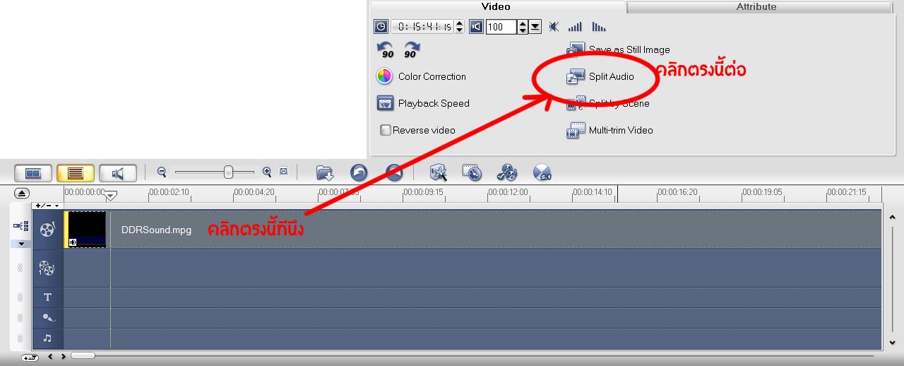 ทีนี้เราจะมาลบเสียงพูดในการ์ตูนกัน ก่อนอื่นก็กดที่ตัวไฟล์หนังใน Timeline ก่อน แล้วดูตรง Option Panel แถบ Video คลิกคำว่า Split Audio ก็จะมีไฟล์เสียงโผล่มาที่ช่อง Timeline ให้เราลากมันไปเก็บไว้ที่ Library ก่อน เผื่อเราทำผิดพลาดจะได้มีไฟล์สำรอง
