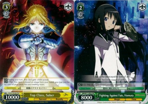 ตัวอย่างการ์ด Weiss Schwarz (เป็นการ์ดที่ใช้ภาพจากอนิเมะ แบ่งเป็นชุดเซ็ตตามเรื่อง)