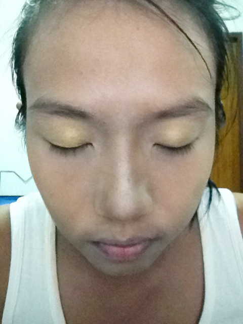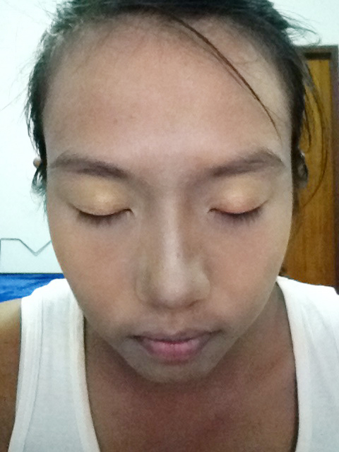 1.ลงสีขาวให้ทั่วเปลือกตา (อาจจะใช้เป็นตัวไฮไลท์ก็ได้)